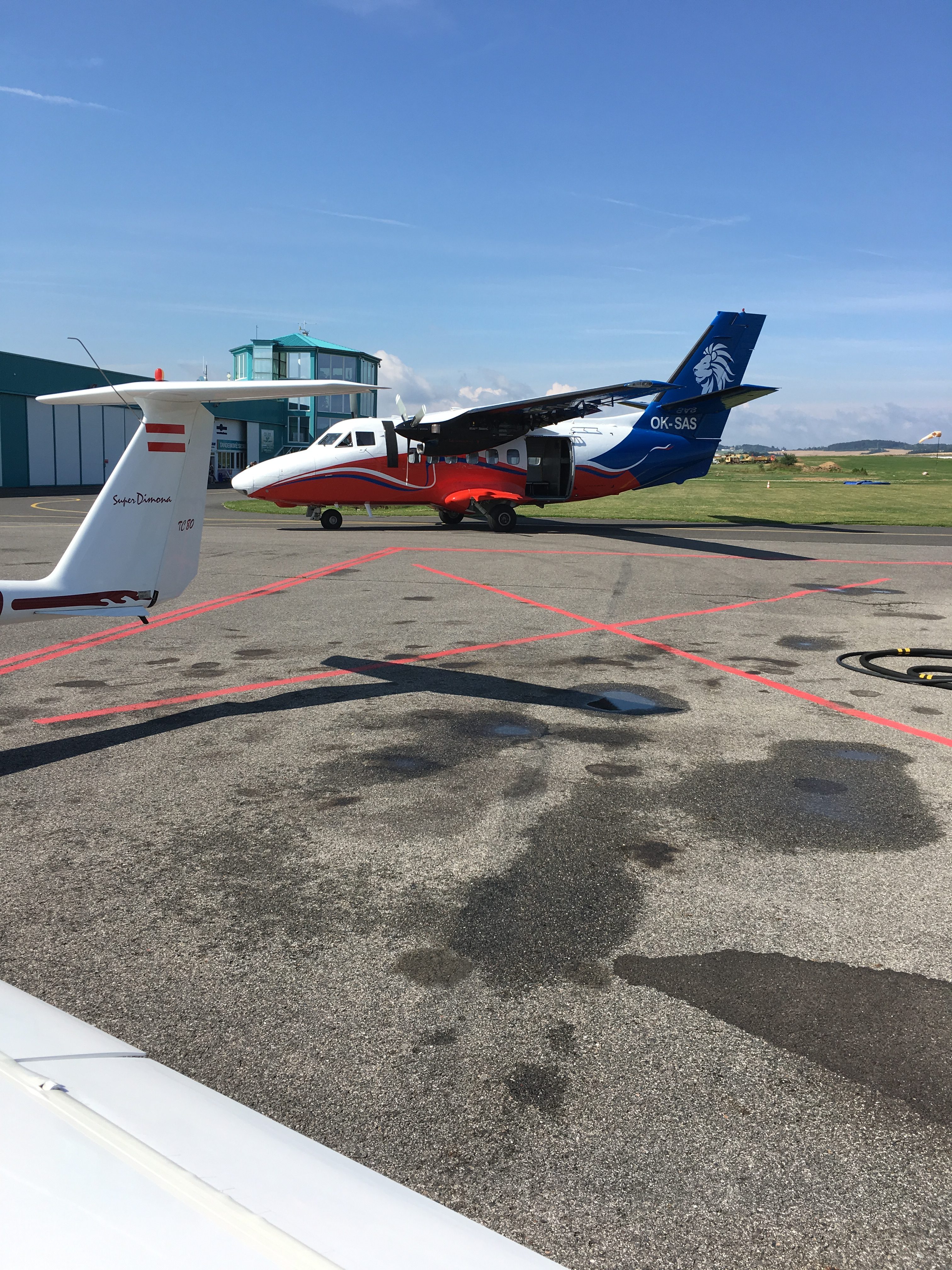 Dem Reinald gefällt die bauchige Fallschirmspringer-Absetzmaschine fast besser als unsere Cessna Caravan. Und er hat das Foto gemacht, weil die viel grössere 2-mot sich anschickt, das Heck unserer kleinen Dimona anzustupsen.