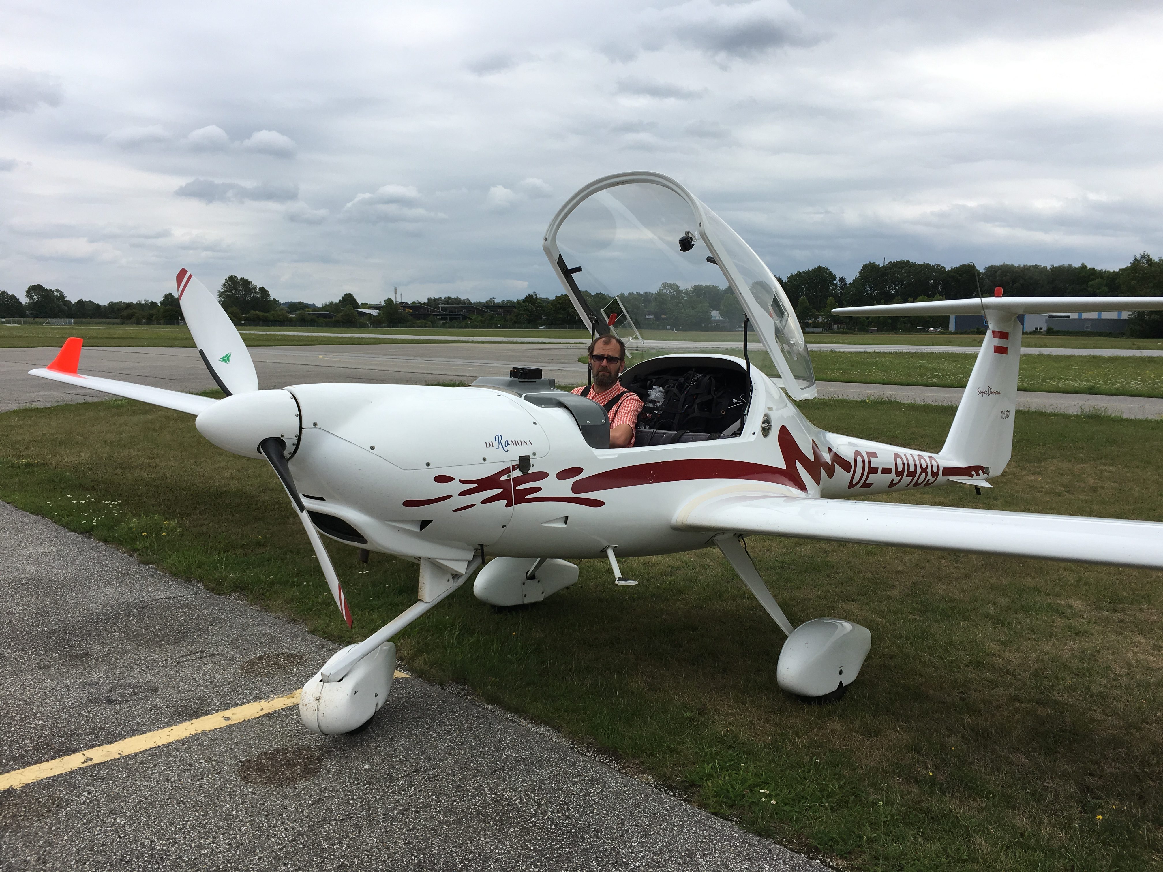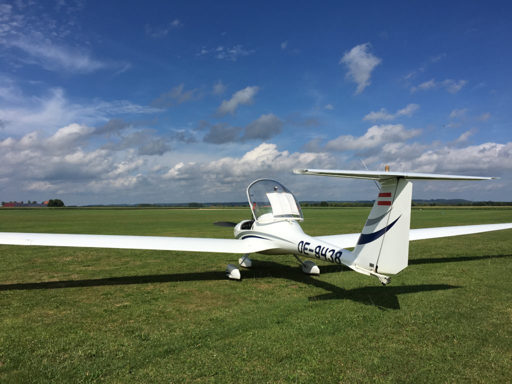 Das unten auf dem Kopf stehende Bild zeigt das Flugzeug von Reinald. Es ist eine Super TurboDimona mit 115 PS, Bugrad, Sonnenverdeck und Kennzeichen OE-9438