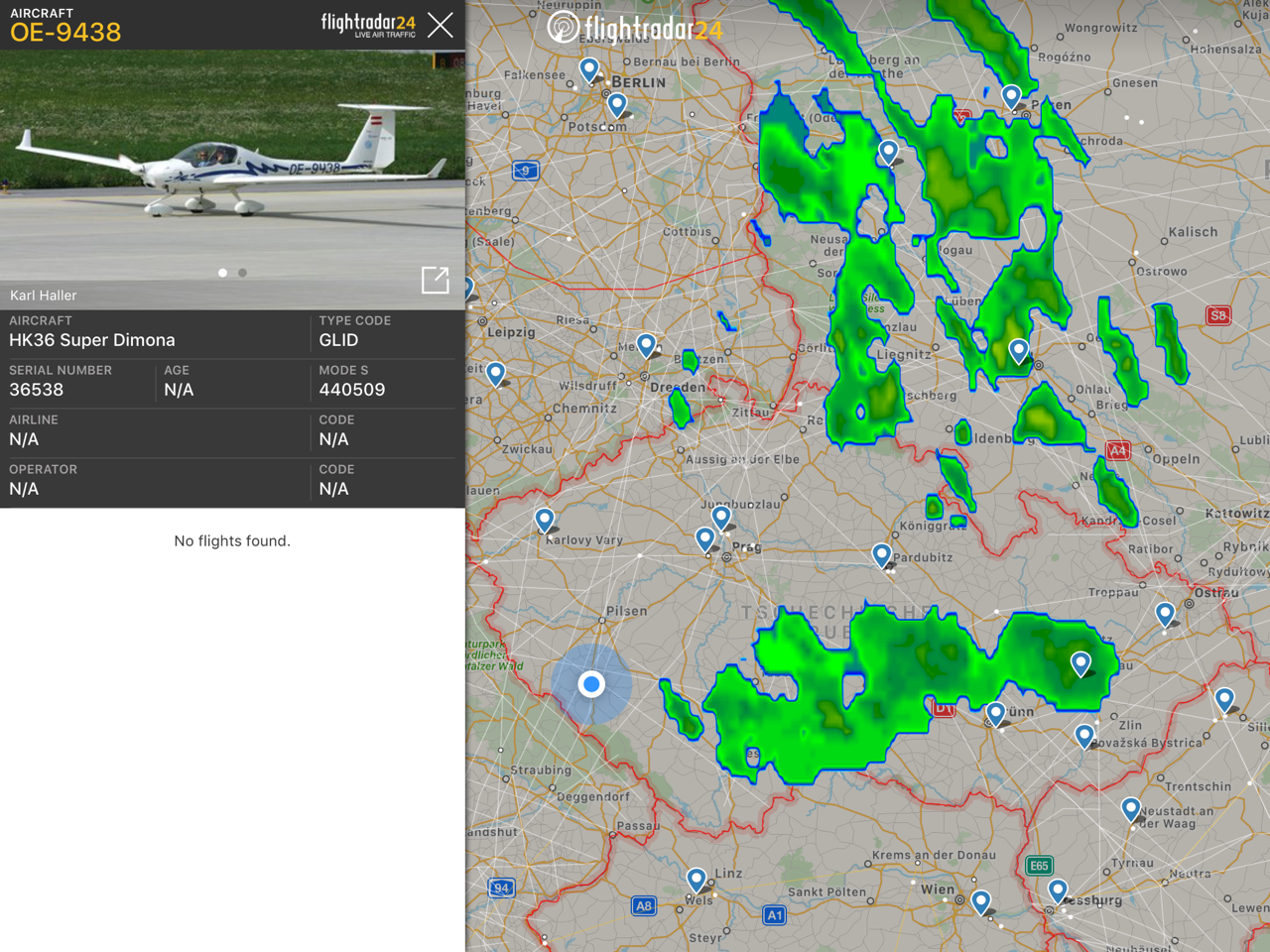 Der blaue Punkt (mit hellblauem Kreis) ist unser von „Flightradar24“ aufgezeichnete Standort.